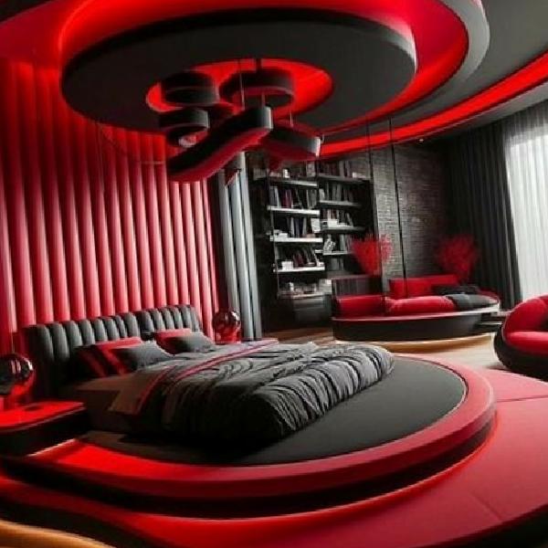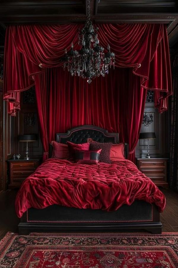 Kırmızı ve siyahın mükemmel uyumu gerçekten insanın enerjisini hemen yükseltiyor. Bu odada da iki rengi o kadar güzel kullanmışlar ki kabul edelim partnerinizle uzun bir süre buradan çıkmak istemeyebilirsiniz.