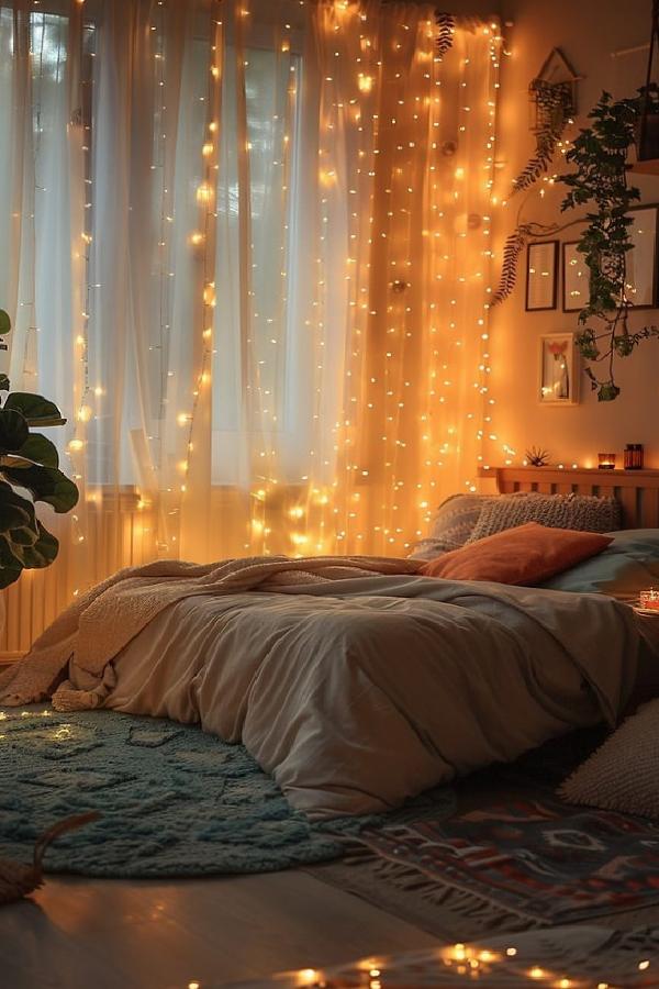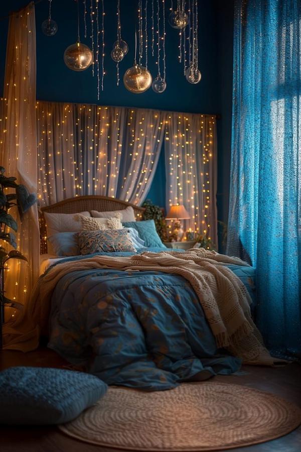 Her şey kırmızı, siyah veya pembe olmak zorunda değil. Işıklar ile süslenmiş odalar da partnerinizle olan aşkınızı pekiştirebilir ve heyecanınızı artırabilir. Şu odada birlikte uyuyup hayal kurmanın keyfini düşününce gerçekten daha da etkileyici oluyor!