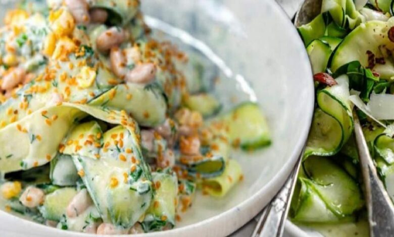 Yoğurt soslu çiğ kabak salatası tarifiyle yaz sofralarına ferahlık katın; taptaze kabaklar, Nar ekşisiyle hafif lezzet birleşimi.