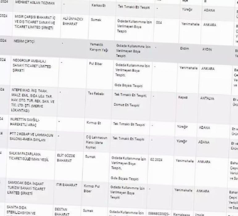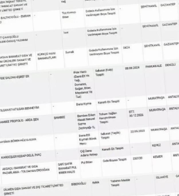Testlerde zeytinyağı, sumak, kebap, tereyağı, kekik, pul biber üzere eserlerde sıhhati tehdit eden ve taklit-tağşiş yapılan unsurlar bulundu.
