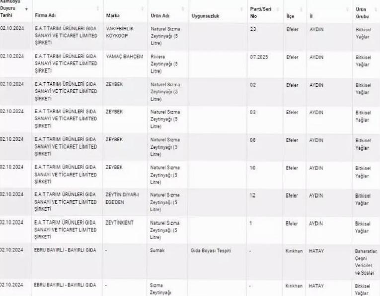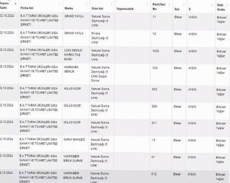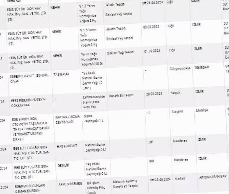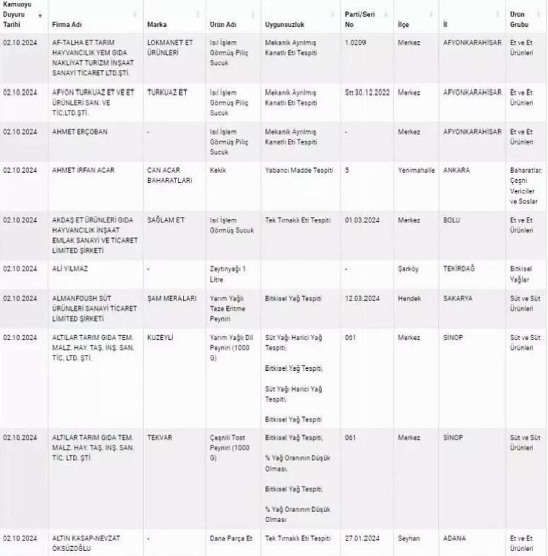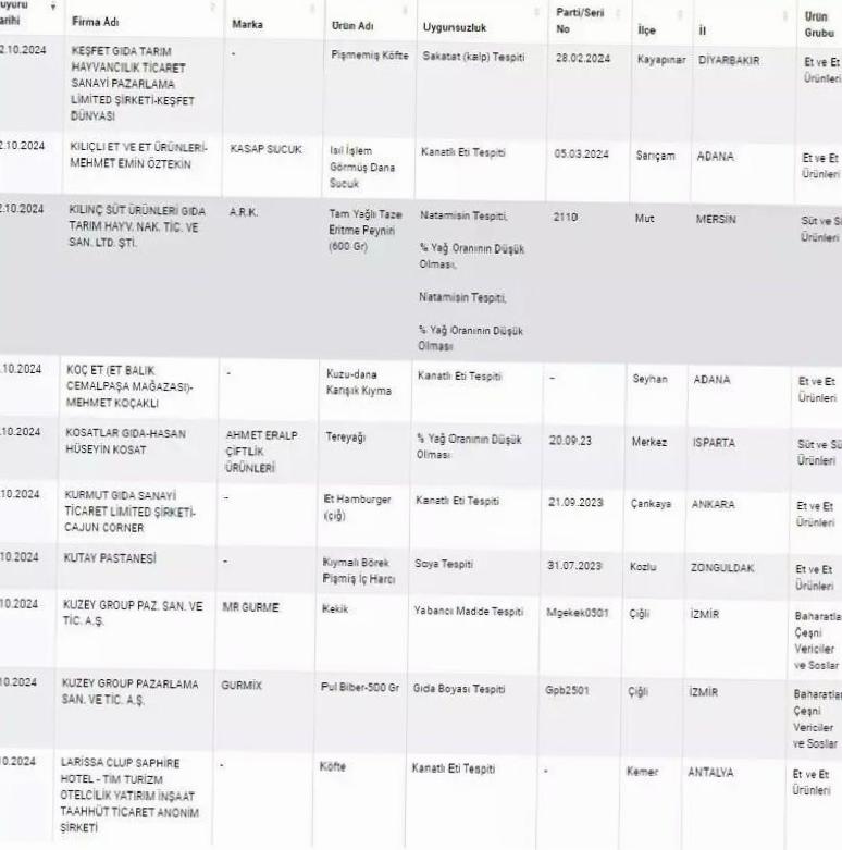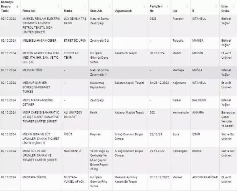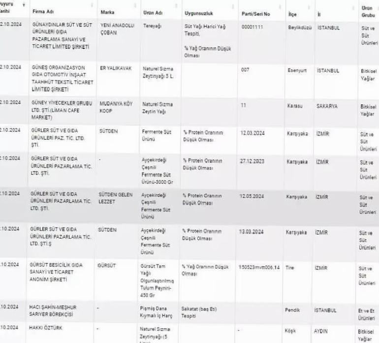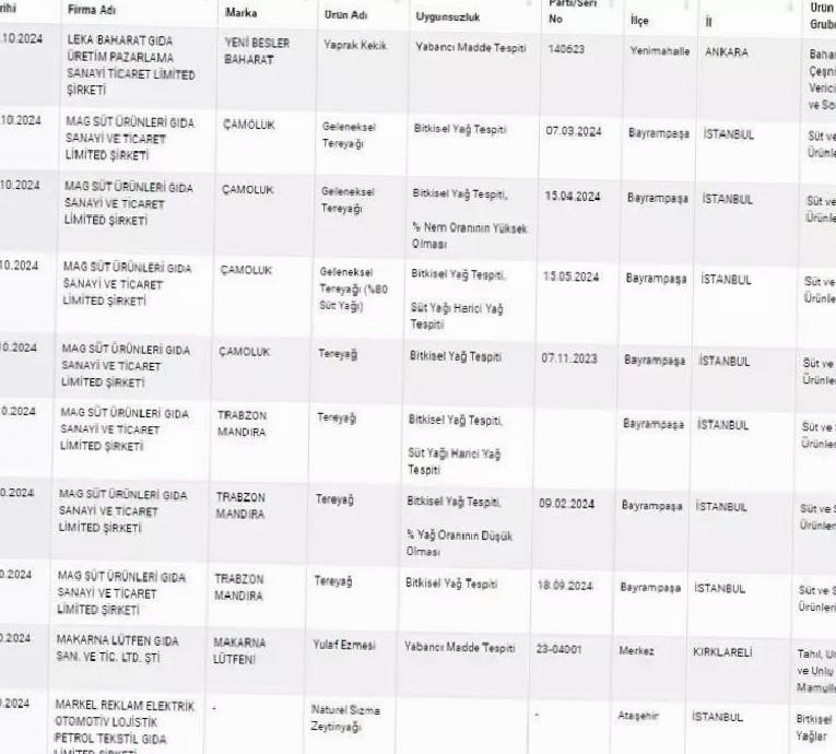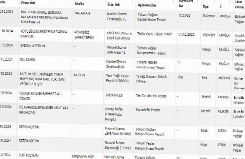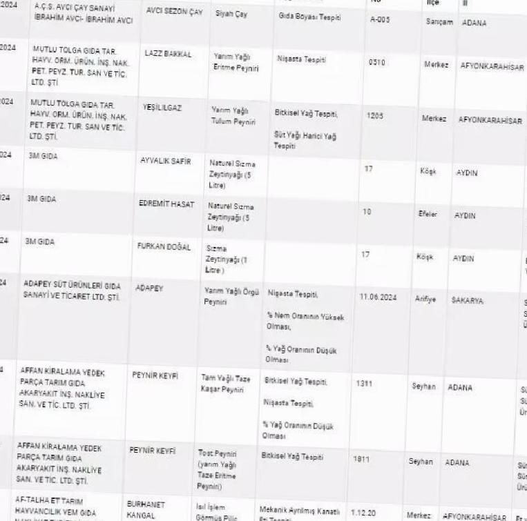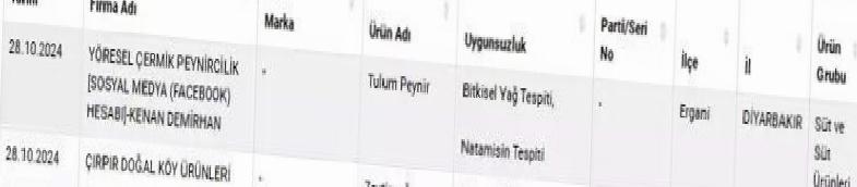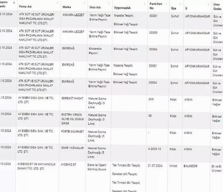 Bakanlık, kontroller sonucunda uygunsuz bulunan eserlerin ve firmaların listesini kamuoyuna sundu. 17 Ekim 2024 tarihli duyuruda, peynir ve tereyağı eserlerinde yapılan incelemelerde natamisin tespiti nedeniyle uygunsuz bulunan markalar ve eserler açıkça belirtildi. Kelam konusu firmalar ve eserleri, bakanlığın resmi web sitesinde ayrıntılı olarak paylaşıldı.