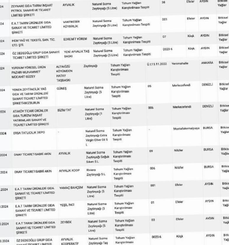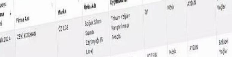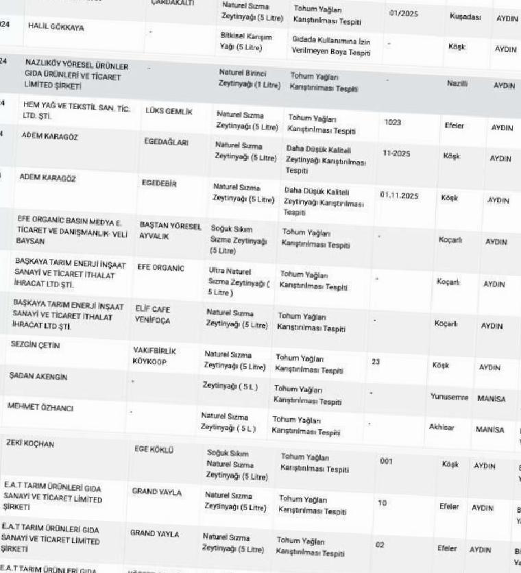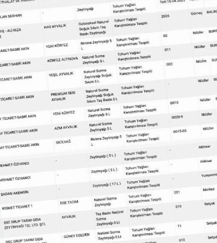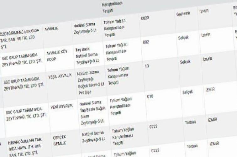 Zeytinyağı olarak satılan kimi eserlerde ayçiçek yağı üzere daha ucuz tohum yağlarının karıştırıldığı yahut büsbütün kullanıldığı tespit edildi.