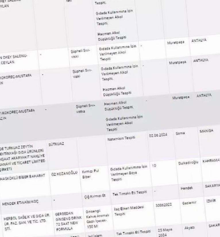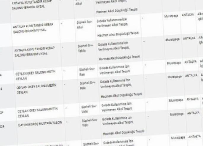 Öte yandan yeniden Antalya’da faaliyet gösteren bir okey salonundaki besinlerde da viski ve rakı çıktığı listeye eklendi.