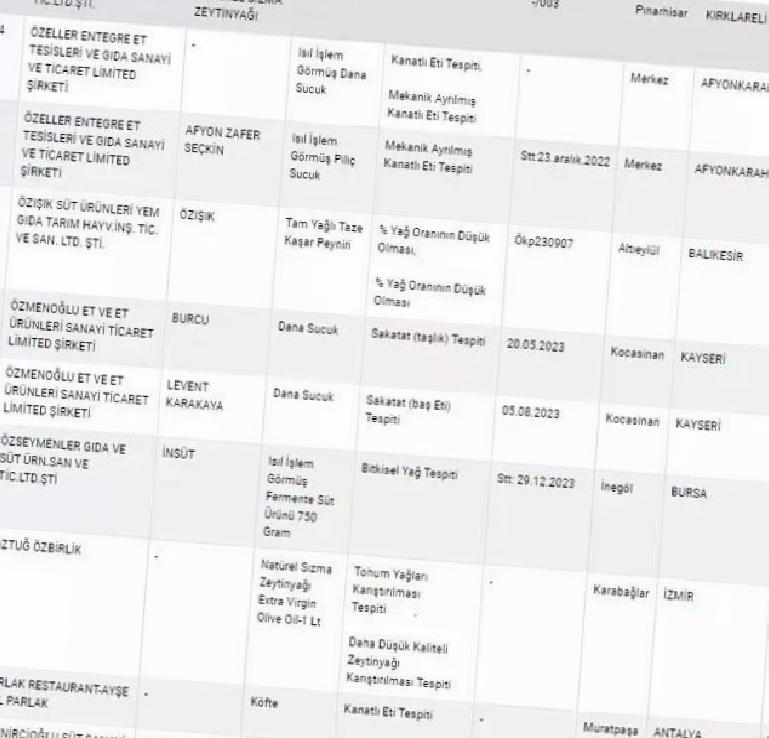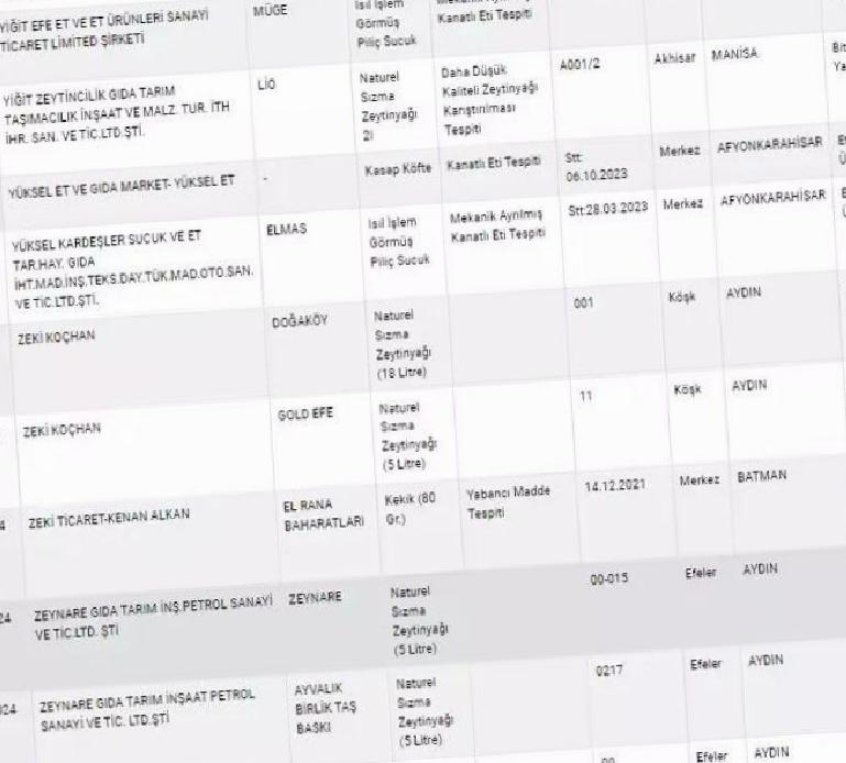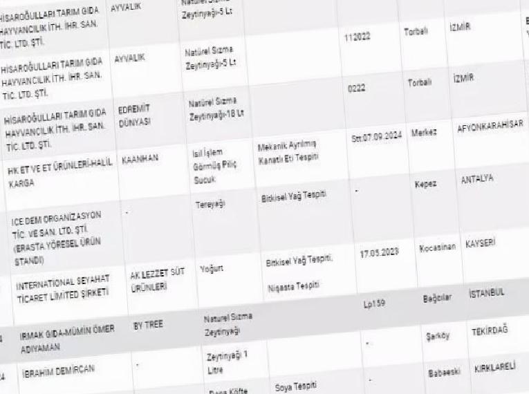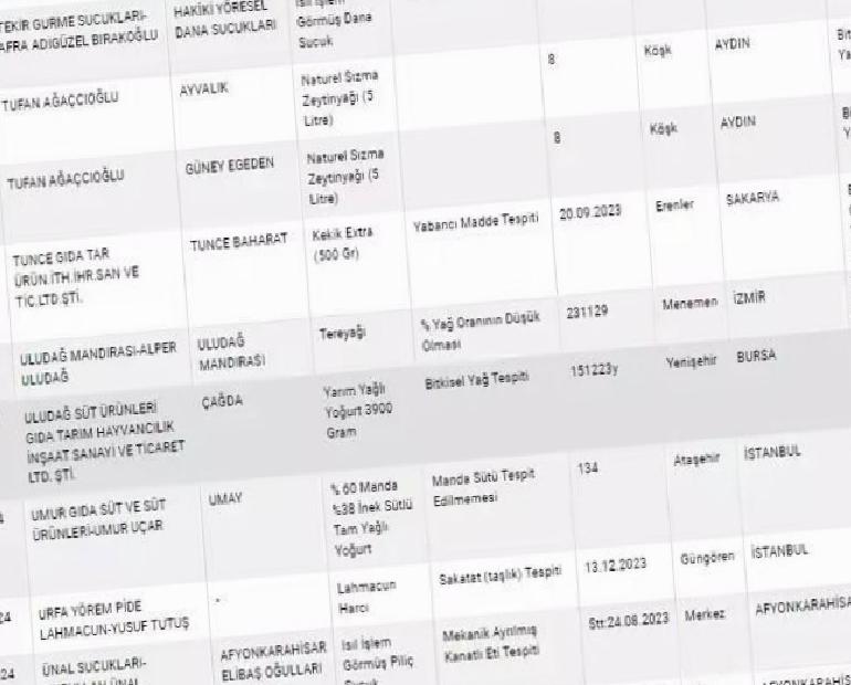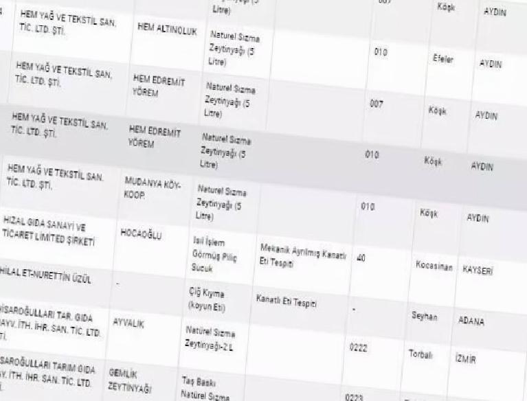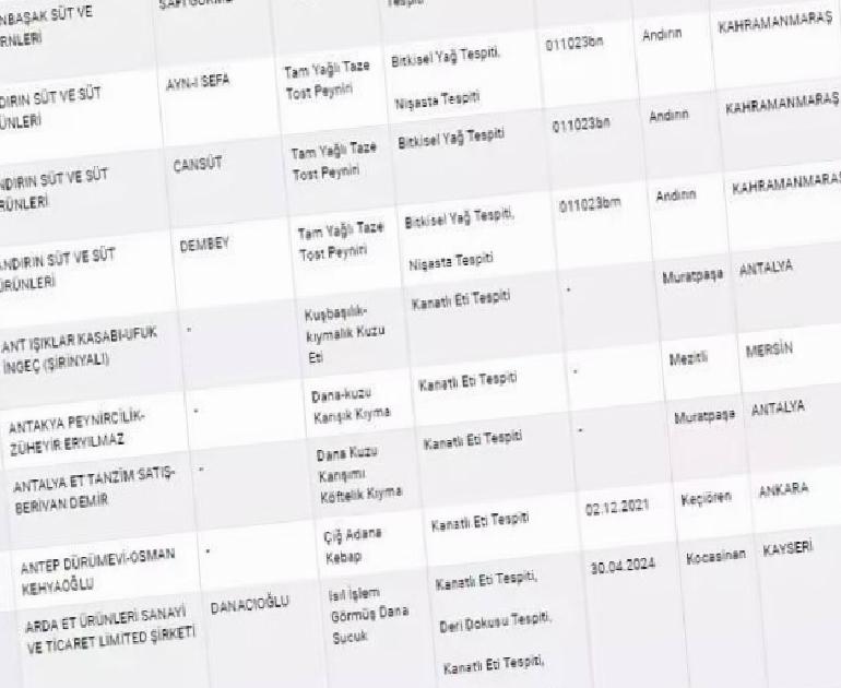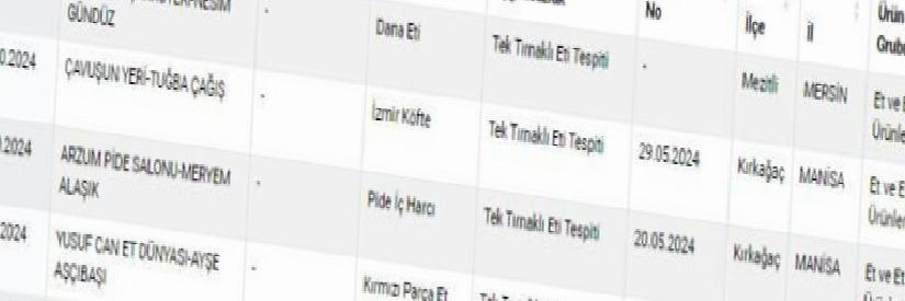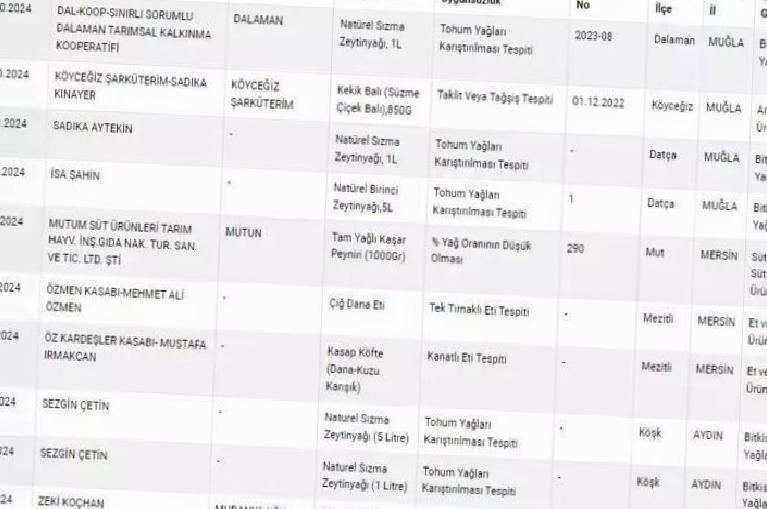 Son güncellemede besin hilekarlarının“Aydın, Muğla, Mersin, Adana ve Manisa” kentlerinde olduğu gözlemlendi. Son listedeki sahtekarlığın kırmızı et, zeytinyağı, peynir ve balda yapıldığı görüldü. Buna nazaran zeytinyağına tohum yağı, balda sahtecilik, peynirde hile, dana etinde tek tırnaklı eti (at-eşek), köftede tavuk eti karışımı tespit edildi.