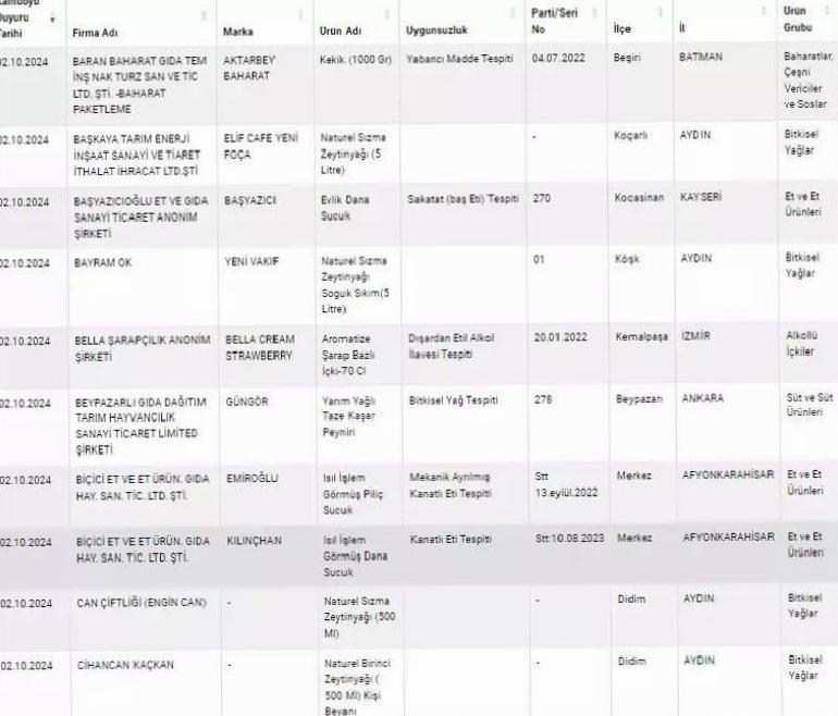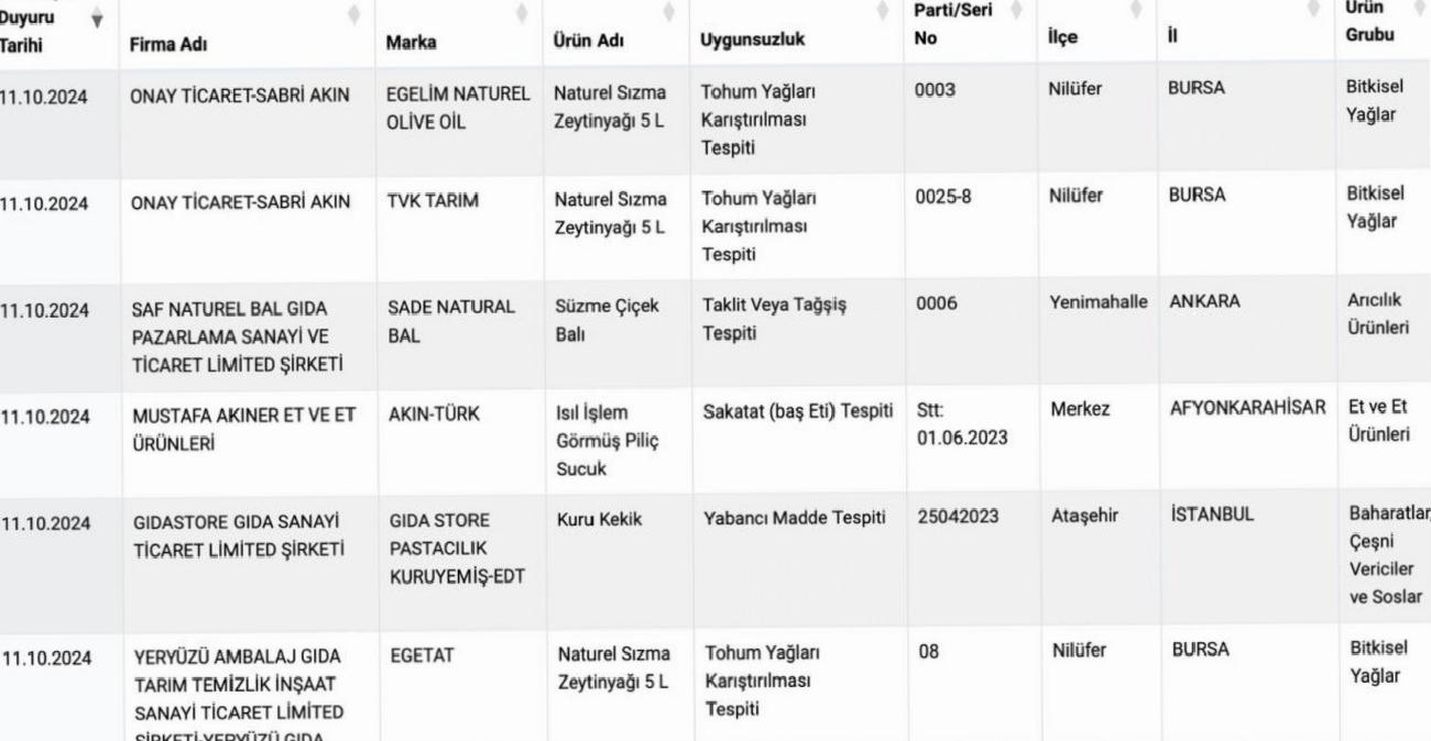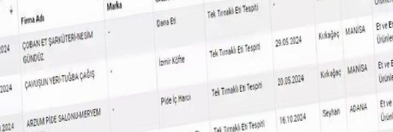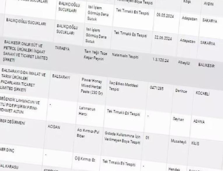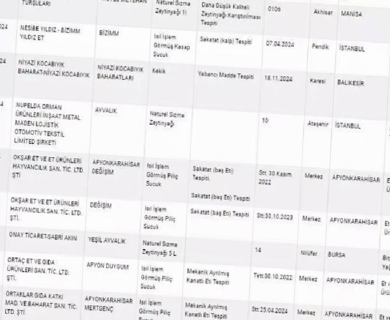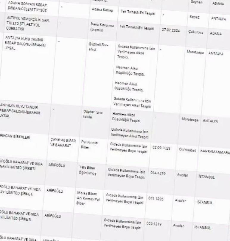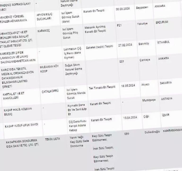 Son güncellemede besin hilekarlarının“Aydın, Muğla, Mersin, Adana ve Manisa” kentlerinde olduğu gözlemlendi. Son listedeki sahtekarlığın kırmızı et, zeytinyağı, peynir ve balda yapıldığı görüldü. Buna nazaran zeytinyağına tohum yağı, balda sahtecilik, peynirde hile, dana etinde tek tırnaklı eti (at-eşek), köftede tavuk eti karışımı tespit edildi.