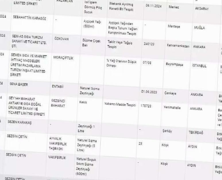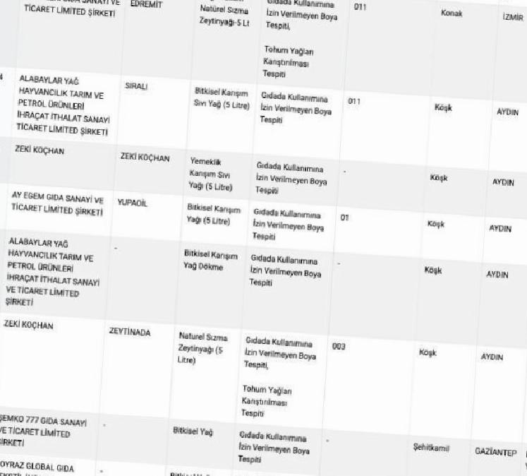 Bu listede de Gaziantep, Şehitkamil ilçesinde Poyraz Ltd. şirketinin bitkisel yağa besinde kullanımına müsaade verilmeyen boya kullandığı tespit edildi.
