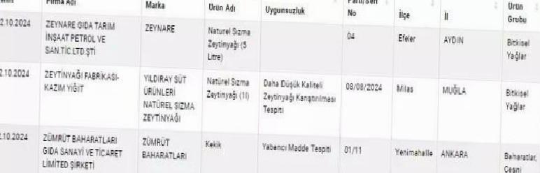 Bakanlık son yaptığı testlerde kekikte yabancı unsur, salça yerine boya satıldığını ortaya çıkardı. Ayrıyeten zeytinyağlarında tekrar tohum yağları çıktı.
