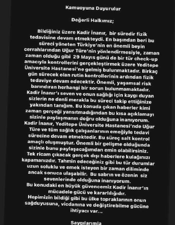 “Önemli yaşamsal risk barındıran rastgele bir sorun bulunmamaktadır. Yeditepe Üniversite Hastanesinde Uğur Tipe ve tüm sıhhat çalışanlarının emeğiyle tedavi sürecine devam etmektedir. Bu süreç salt denetim hedefli olmuştur. Kıymetli bir gelişme olduğunda sizinle bunu paylaşacağımdan emin olabilirsiniz. Tek ricam gerçek dışı haberlere kulağınızı kapamanızdır. Kestirim edeceğiniz üzere bu tıp durumlar uzun soluklu ve emek isteyen bir vakit diliminde fakat sonuca ulaşabilir. Bu sabrın ve ihtimamın siz sevenlerinde olduğuna inanıyorum. Bu mevzudaki en büyük teminatımız Kadir İnanır’ın uğraş gücü ve kararlığıdır. Hepimizin bildiği üzere bu ülke topraklarının onu sağduyusuna, vicdanına ve değiştirebilme gücüne muhtaçlığı var.”