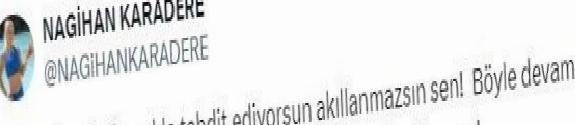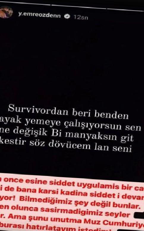 Nagihan’ın paylaşımlarının akabinde tezleri yalanlayan Yunus Emre, hesabından yaptığı paylaşımda “Survivor’dan beri benden dayak yemeye çalışıyorsun sen ne değişik bir manyaksın. Git kestir kelam döveceğim lan seni” dedi. Yunus Emre’nin paylaşımının akabinde yeni bir paylaşımda bulunarak tezlerine sürat kesmeden devam eden Nagihan ise o sözlere “Daha evvel eşine şiddet uygulamış bir canlı artık de bana karşı bayana şiddeti devam ettiriyor. Bilmediğimiz şey değil bunlar. Senden olunca şaşırmadığımız şey bunlar. Fakat şunu unutma Muz Cumhuriyeti değil burası hatırlatayım istedim” diyerek karşılık verdi.