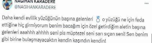 Sonrasında yaptığı paylaşımlarla Yunus Emre’ye adeta öfke kusan Nagihan paylaşımında “Tiyniyetsiz müptezel boş yapmasın hele onun kendi karısı için bile kuşku duyan aciz bir varlık o! Kendi karısının bile hamileliğinden kuşku duyduğunu ve birçok kaç mevzuları bir açarsam insan içine çıkamaz DNA der susarım! Benimle dans edemez o açtırmasın bayramlık ağzımı. Alo! Eceli gelen müptezel köpek cami duvarına işermiş! Senin adada yaptığın her pisliğini A’dan Z’ye çarşaf çarşaf anlatmazsam insan değilim pis hırsız! Yaptıkların yanına kar mı kalacak sanıyorsun?” ifadelerine yer verdi.