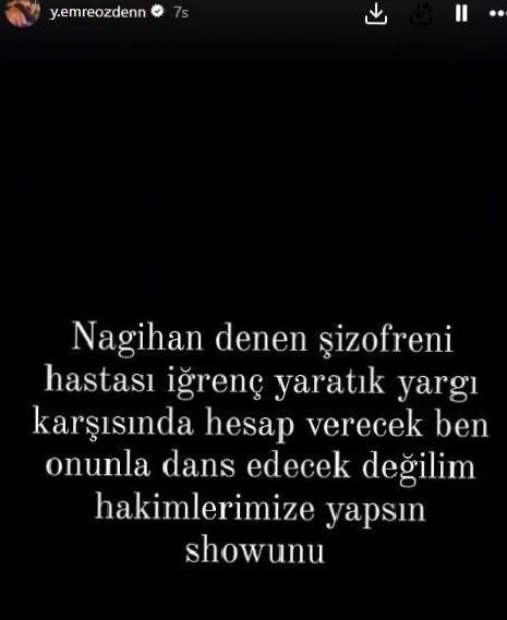 Karadere’nin paylaşımlarına toplumsal medya hesabından yaptığı paylaşımlarla karşılık veren Yunus Emre ise dava açacağını söyleyerek “Nagihan denen şizofreni hastası, iğrenç yaratık yargı karşısında hesap verecek. Ben onunla dans edecek değilim yargıçlarımıza yapsın şovunu” sözlerini kullandı.