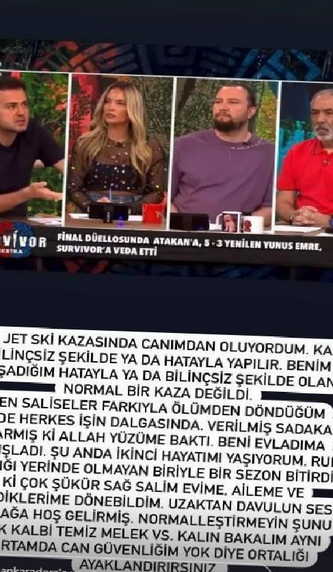 “Ben jet ski kazasında canımdan oluyordum. Kaza bilinçsiz halde ya da yanılgıyla yapılır. Benim yaşadığım yanlışla ya da bilinçsiz halde olan olağan bir kaza değildi. Ben saliseler farkıyla mevtten döndüğüm halde herkes işin dalgasında… Verilmiş sadakam varmış ki Allah yüzüme baktı. Beni evladıma bağışladı. Şu anda ikinci hayatımı yaşıyorum. Ruh sıhhati yerinde olmayan biriyle bir dönem bitirdim ki çok şükür sağ salim konutuma döndüm. Aileme ve sevdiklerime dönebildim. Uzaktan davulun sesi kulağa beğenilen gelirmiş. Normalleştirmeyin şunu yok kalbi pak, melek vs… Kalın bakalım tıpkı ortamda ‘can güvenliğim yok’ diyerek ortalığı ayaklandırırsınız”