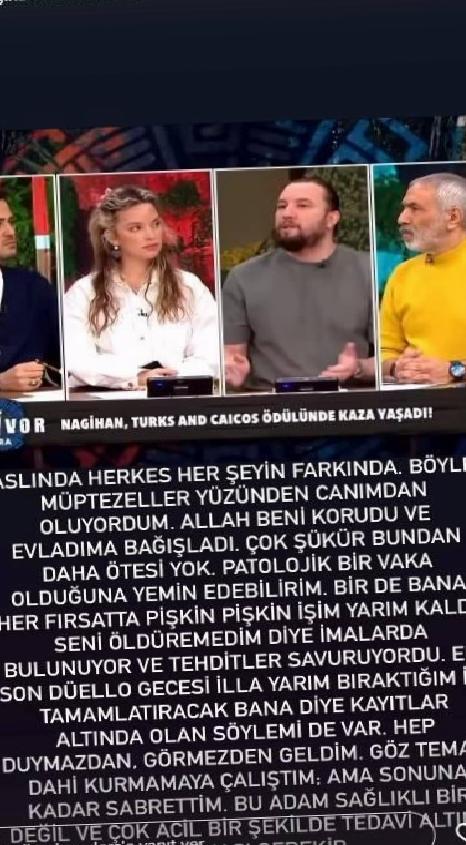 Survivor All Star’da elenerek adaya veda eden Yunus Emre’nin ayrılığının akabinde birlikte yarıştığı yarışmacı Nagihan Karadere, ağızları açık bırakan argümanlarda bulunmuştu. Yunus Emre’nin vedasının akabinde adada meseleler yaşadığı Nagihan toplumsal medya hesabı üzerinden ifşa paylaşımlarında bulunmuştu. Nagihan’ın paylaşımlarına Yunus Emre’den yanıt gecikmedi. İkili ortasında hakaret ve tehditler havada uçuştu.