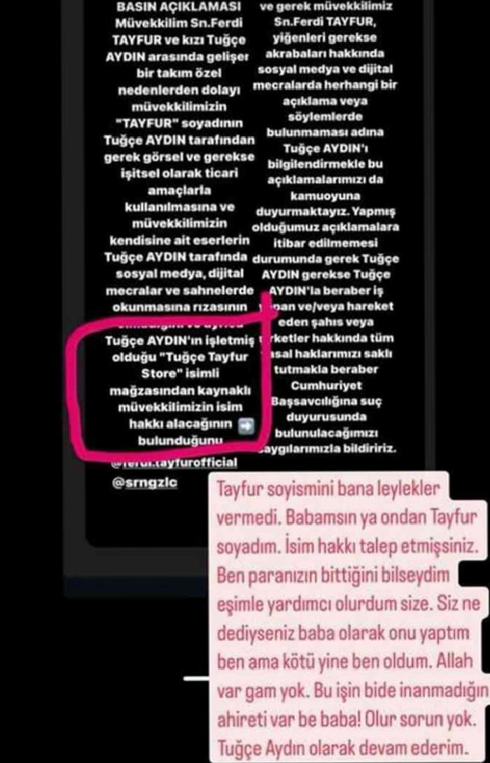 “Müvekkilim Sn. Ferdi TAYFUR ve kızı Tuğçe AYDIN ortasında gelişen bir grup özel nedenlerden ötürü müvekkilimizin “TAYFUR” soyadının Tuğçe AYDIN tarafından gerek görsel ve gerekse işitsel olarak ticari maksatlarla kullanılmasına ve müvekkilimizin kendisine ilişkin yapıtların Tuğçe AYDIN tarafından toplumsal medya, dijital mecralar ve sahnelerde okunmasına isteğinin olmadığını ve ayrıyeten Tuğçe AYDIN’ın işletmiş olduğu “Tuğçe Tayfur Store” isimli mağazasından kaynaklı müvekkilimizin isim hakkı alacağının bulunduğunu ve gerek müvekkilimiz Sn.Ferdi TAYFUR, yeğenleri gerekse akrabaları hakkında toplumsal medya ve dijital mecralarda rastgele bir açıklama yahut telaffuzlarda bulunmaması ismine Tuğçe AYDIN’I bilgilendirmekle bu açıklamalarımızı da kamuoyuna duyurmaktayız. Yapmış olduğumuz açıklamalara prestij edilmemesi durumunda gerek Tuğçe AYDIN gerekse Tuğçe AYDIN’la bir arada iş yapan ve/veya hareket eden şahıs yahut şirketler hakkında tüm yasal haklarımızı gizli tutmakla birlikte Cumhuriyet Başsavcılığına cürüm duyurusunda bulunulacağımızı hürmetlerimizle bildiririz”