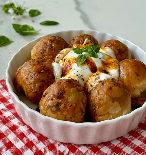 • Servis için üzerine sarımsaklı yoğurt dök, kızdırılmış tereyağında toz biberle sos yap ve gezdir.